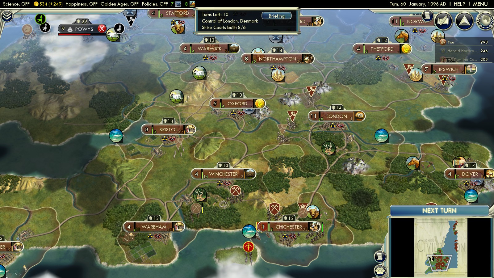 Playing Denmark the biggest challenge is the stupidity of both Norway and Normandy to capture a significant number of English cities. I mean, the first attempt: Gone in 15 turns! How does England even build all those Domesday Shire Courts AND the Domesday Book in that time???